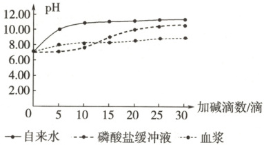 (3)①${NaOH}$ 磷酸盐缓冲液 ②设置添加${HCl}$溶液组,分别在自来水、磷酸盐缓冲液、血浆中加入5滴0.1 mol/L的${HCl}$溶液,摇匀并测pH,重复这一步骤直到加入30滴为止,绘图观察pH变化