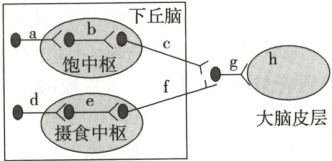 3.D [反射弧是完成反射的结构基础,其包括感受器、传入神经、神经中枢、传出神经与效应器。图中仅表示了由下丘脑传至大脑皮层产生饱食感或饥饿(摄食)感的“上传”过程,并不表示相关“反射应答”过程,故不存在完整反射弧。因此D正确,A、B、C错误。]