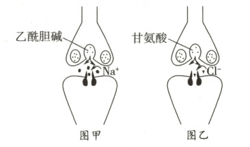 3.C [根据题干信息可知,图甲中乙酰胆碱为兴奋性神经递质,乙酰胆碱与突触后膜上受体特异性结合,使突触后膜兴奋,膜外电位由正变负,A错误;图乙中突触后膜上神经递质的受体与氯离子通道蛋白作用不同,受体与甘氨酸结合,使氯离子通道打开,${Cl^{-}}$内流,B错误;正常生理条件下,乙酰胆碱起作用为神经递质,发挥作用后会被清除,C正确;图乙所示过程引起${Cl^{-}}$内流,效应是使突触后膜产生抑制,D错误。]