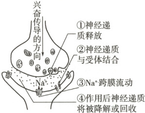 1.C [突触小泡包裹着神经递质运动到突触前膜,突触小泡膜与突触前膜融合,释放神经递质,该方式为胞吐,A正确;图中释放的神经递质与突触后膜上的相关受体结合,引起${Na^{+}}$通道打开,${Na^{+}}$内流使突触后膜神经元产生兴奋,B正确,C错误;神经递质与突触后膜上的相关受体结合,形成递质—受体复合物,从而改变突触后膜对离子的通透性,引发突触后膜电位变化,随后,神经递质会与受体分开,并迅速被降解或回收进细胞,D正确。]