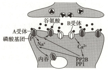 C.谷氨酸与B受体结合后,$\mathrm{Ca^{2+}}$内流引起突触后膜上A受体增多