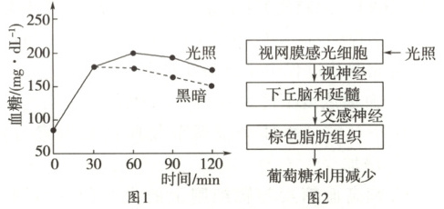 7.A [血糖代谢的调节除了如图2所示的神经调节之外,还存在胰岛素、胰高血糖素等激素调节,A错误;由图1可知,光照和黑暗条件下口服等量葡萄糖,光照下血糖浓度高于黑暗条件下血糖浓度,说明与夜间黑暗条件相比,光照条件下受试者利用葡萄糖的速率下降,B正确;光照通过反射弧使交感神经作用于棕色脂肪组织利用葡萄糖减少,若棕色脂肪组织的代谢被抑制,则黑暗条件下葡萄糖的利用也会减少,即图1两条曲线趋于重叠,C正确;光可通过神经调节的方式影响糖代谢,其信号传导途径是光→视网膜感光细胞→视神经→下丘脑神经→交感神经→棕色脂肪组织,葡萄糖利用减少,导致血糖上升,故长期熬夜的不良生活方式可增加患糖代谢相关疾病的风险,D正确。]