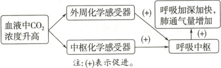 3. D [人体细胞中${CO_{2}}$是通过有氧呼吸产生的,场所是线粒体,A正确;人体的呼吸中枢位于脑干,B正确;血液中的${CO_{2}}$(属于体液中的化学物质)浓度升高会刺激呼吸中枢(含有神经中枢),导致呼吸加快,该调节方式属于神经—体液调节,C正确;题中过程中调节呼吸的反射弧是外周化学感受器→传入神经→呼吸中枢→传出神经→呼吸肌,效应器是传出神经末梢和它所支配的呼吸肌,D错误。]