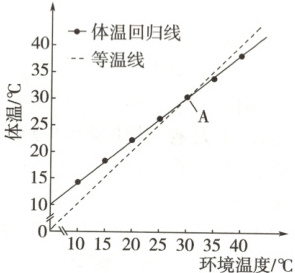 8.无蹼壁虎是我国华北地区最常见的一种壁虎科动物,科研人员欲在实验温度条件下探究无蹼壁虎的体温与环境温度的关系,相关实验结果如图所示。研究得出无蹼壁虎的体温回归线与等温线相交在29.5 ℃左右(A点),在此温度区域,壁虎体热与环境热能交换趋于平衡。下列叙述错误的是 ()
