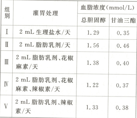 (2)花椒麻素是花椒的主要成分,辣椒素是辣椒的主要成分。为研究花椒麻素和辣椒素对血脂的调节作用,研究人员进行了以下实验:
