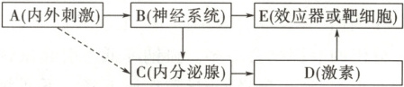 8. A [水盐平衡调节属于神经—体液调节过程,下丘脑是水盐平衡调节中枢,通过抗利尿激素作用于靶器官,水盐平衡调节的过程可通过$A \to B \to C \to D \to E$来实现,A错误;血糖平衡调节的过程可以通过$A \to C \to D \to E$来实现,属于体液调节,即血糖上升或下降的刺激直接作用于胰岛,刺激胰岛分泌相应的激素来作用于靶细胞或靶器官实现对血糖的调节,B正确;当人的手被针扎时,其调节过程可能通过$A \to B \to E$来实现,属于神经调节,该过程需要经过完整的反射弧,C正确;若上图实线即$A \to B \to E$和$A \to B \to C \to D \to E$表示体温调节过程,则体温调节过程属于神经和神经—体液调节,D正确。]