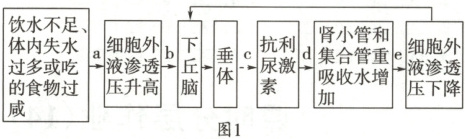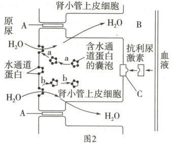 。(3)图 2 为抗利尿激素调节肾小管上皮细胞对水的通透性变化示意图,图中 A、B、C 代表不同的结构或物质,a、b 代表含水通道蛋白的囊泡的不同转运过程。从水通道蛋白的角度,结合抗利尿激素的作用,分析当抗利尿激素减少时,尿量增多的原因是