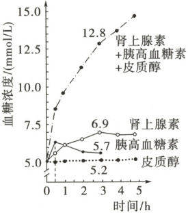1. B [据图分析,激素单独作用时,0.5 h内升高血糖最快的激素是胰高血糖素,A错误;3 h时,三种激素联合作用升高血糖的效应为$12.8 - 5.0 = 7.8$ mmol/L,三种激素各自效应的总和为$(6.9 - 5.0) + (5.7 - 5.0) + (5.2 - 5.0) = 2.8$ mmol/L,前者明显大于后者,B正确;肾上腺素和胰高血糖素都能升高血糖,二者在调节血糖方面表现出协同作用,C错误;实验结果可证明血糖浓度受肾上腺素、胰高血糖素和皮质醇调节,但实验结果不能证明血糖浓度不受甲状腺激素调节,D错误。]