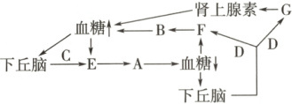 2. C [正常人血糖浓度为 3. 9~6. 1 mmol/L,糖尿病患者血糖浓度高,可能出现尿糖现象,A正确。题图中A会使血糖浓度降低,为E(胰岛B细胞)分泌的胰岛素,B可使血糖升高,为F(胰岛A细胞)分泌的胰高血糖素。当血糖浓度高时,位于下丘脑中的相关区域接受刺激产生兴奋,通过副交感神经进一步促进胰岛B细胞分泌胰岛素,胰岛素作用于靶细胞,促进葡萄糖的氧化分解;当血糖浓度降低时,位于下丘脑中的相关区域接受刺激产生兴奋,通过交感神经控制胰岛A细胞释放胰高血糖素增加,最终使血糖浓度维持相对稳定。故题图中C为副交感神经,D为交感神经,二者功能往往是相反的,肾上腺索由肾上腺髓质分泌,故G为肾上腺髓质,C错误。胰岛素可降低血糖,胰高血糖素可使血糖浓度升高,故胰岛素与胰高血糖素在调节血糖时的效应表现为相抗衡;胰高血糖素能升高血糖,血糖升高后又需要胰岛素的作用,故胰高血糖素分泌增加会促进胰岛素分泌,D正确。]