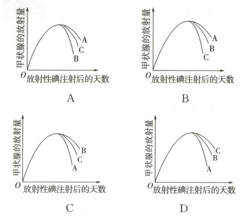 4. 将含有放射性碘的注射液注射到体重和生理状况相同的 A、B、C 三组兔子体内,然后定时测定兔子甲状腺的放射量;4 天后,向 A 组兔子注射无放射性的甲状腺激素,向 B 组兔子注射无放射性的促甲状腺激素;向 C 组兔子注射生理盐水。下列能正确反映三组兔子体内甲状腺放射量变化的是 (