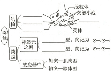 1. 突触的结构包括突触小体、突触间隙和突触后膜。 (