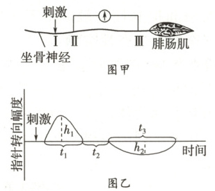 2. 图甲所示标本中,坐骨神经由多条不同的神经纤维组成,电位表的两个电极置于坐骨神经表面Ⅱ、Ⅲ处,在Ⅰ处给予一个适当强度的电刺激,指针偏转情况如图乙,其中$h_1>h_2$,$t_1<t_3$。下列叙述正确的是 (