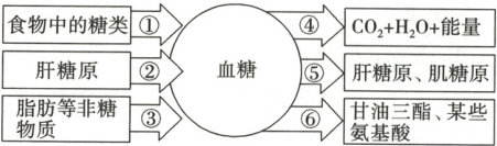 1.B [①是食物中糖类的消化、吸收,该过程是血糖的主要来源,②过程是肝糖原的分解,空腹时血糖的重要来源,③过程可补充血糖,A正确;胰岛素的本质为蛋白质,口服会被消化道内的蛋白酶分解,B错误;当血糖浓度过高时,胰岛素可以促进④有机物的氧化分解、⑤转化为肝糖原和肌糖原及⑥转化为甘油三酯、某些氨基酸,并抑制②肝糖原分解和③脂肪等非糖物质的转化等过程,来降低血糖浓度,使血糖浓度恢复正常,C正确;甲状腺激素和肾上腺素也可提高血糖浓度,故神经系统可通过控制甲状腺和肾上腺的分泌活动来调节血糖浓度,D正确。]