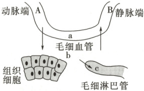 ACD [体内绝大多数细胞为组织细胞,组织细胞生活的环境是b,A错误;大部分b组织液通过毛细血管回渗到a血浆中,小部分通过毛细淋巴管回渗到c淋巴液中,B正确;若B端周围的组织细胞是肝细胞,在饥饿状态下,肝细胞会分解肝糖原形成血糖,此时,B端的养分比A端多,所以A端的营养物质含量并不总是多于B端,C错误;毛细淋巴管内的c淋巴液汇集到淋巴管中,经过淋巴循环由左右锁骨下静脉汇入a血浆中,进入心脏,参与全身的血液循环,D错误。]