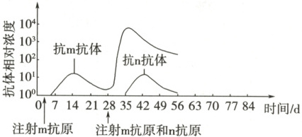 1.提示:28 d之前已经注射过m抗原,因此,此次注射m抗原引起的免疫反应属于二次免疫,而对n抗原的免疫反应则属于初次免疫。