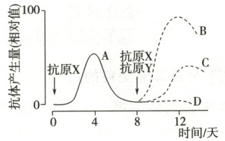 2.(不定项)实验人员将抗原X注射到实验鼠体内,并检测小鼠体内针对抗原X的抗体水平变化,结果如曲线A段所示。在初次免疫后的第8天,实验人员对该实验鼠同时注射了抗原X和抗原Y,随后通过相应的检测方法分析并比较了针对抗原X和抗原Y的抗体产生情况。下列分析合理的是 (