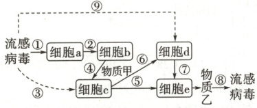 1.(链接$P_{72}$图4-6)下图为流感病毒入侵人体引发的部分免疫反应(数字表示过程,字母表示细胞),下列相关叙述正确的是 ( )
