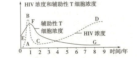 1. (链接 P₇₉ 思考·讨论)艾滋病(AIDS)是由于感染 HIV 引起的一类传染病,人体感染 HIV 后体内 HIV 浓度和辅助性 T 细胞浓度随时间变化如下图。下列相关说法中正确的是 ( )