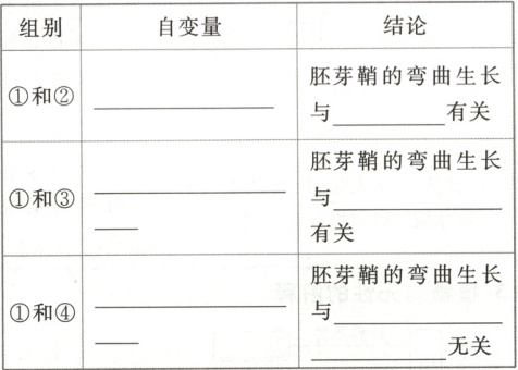 (4)自变量是琼脂块有无接触过胚芽鞘尖端;对照组的作用是排除琼脂块本身对实验结果的干扰,以便更有力地说明导致胚芽鞘弯曲生长的是尖端中的某种化学物质。