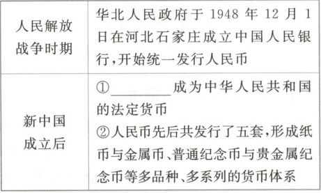 成为中华人民共和国的法定货币②人民币先后共发行了五套,形成纸币与金属币、普通纪念币与贵金属纪念币等多品种、多系列的货币体系|