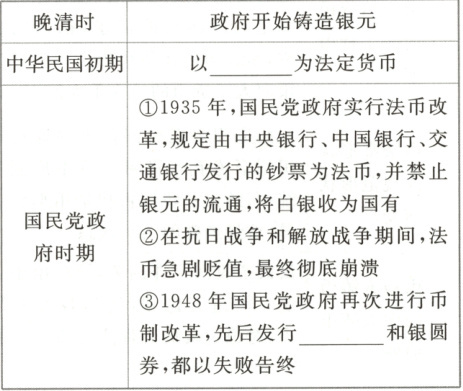 国民党政府时期①1935年,国民党政府实行法币改革,规定由中央银行、中国银行、交通银行发行的钞票为法币,并禁止银元的流通,将白银收为国有