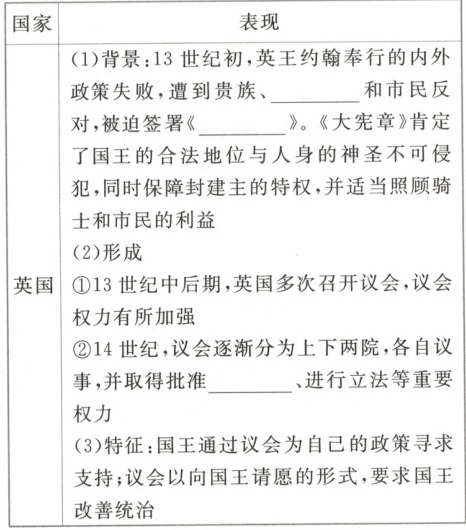 (2)封君 3.世俗王权和基督教会的权力长期并立。国王依靠教会支持获得政权的合法性;教会依靠王权扩展基督教,维护教会权威。 4.城市市民 骑士 大宪章 征税