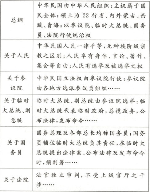 思考:根据材料,说明《中华民国临时约法》体现的资产阶级思想理念,指出孙中山为了防止袁世凯独裁所采用的方法。