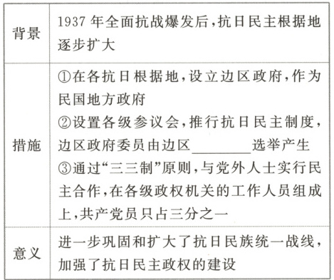 1.提示:边区政权开展以民主选举为核心的民主政治建设,在最广大的范围内充分调动了人民群众的积极性,选举产生抗日民主政权。