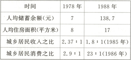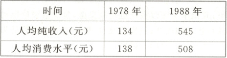 5. (据选择性必修 1 P25“史料阅读”改编)下表是 1978 年和 1988 年我国农民物质生活的变化情况。这一变化主要得益于(