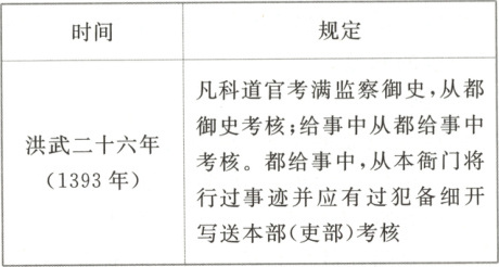 洪武二十六年(1393 年)凡科道官考满监察御史,从都御史考核;给事中从都给事中考核。都给事中,从本衙门将行过事迹并应有过犯备细开写送本部(吏部)考核