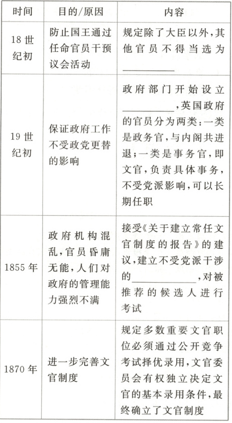 (3)1883年,美国国会通过法案,建立了文官制度。第二次世界大战后,法国、德国和日本等国的文官制度也最终建立起来。