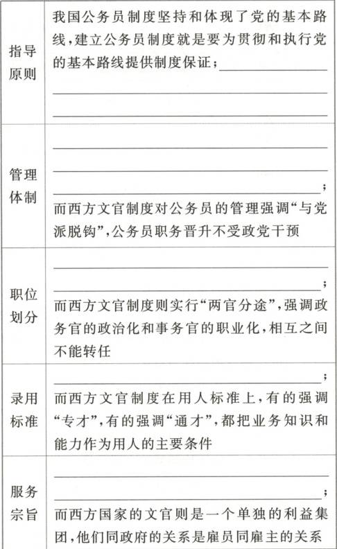 我国公务员制度与西方文官制度的不同,可从指导原则、管理体制、职位划分、录用标准、服务宗旨等方面进行对比。