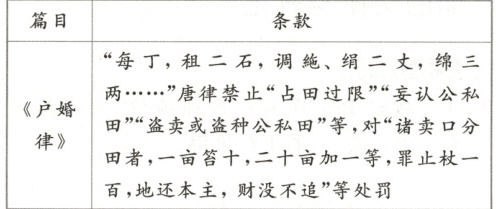 提示:十恶罪以及告发、诅咒父母或祖父母的处罚条款,体现了法律中的儒家思想,说明了唐律礼法结合的特点;唐律禁止盗卖或盗种公私田,严格处罚买卖口分田行为,说明政府限制土地兼并以维护均田制的运行。