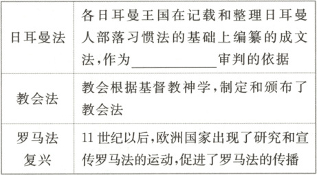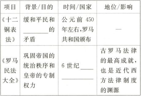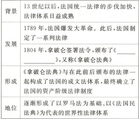 一、1.贵族 东罗马帝国 2.(1)庄园法庭 (2)12世纪前后,建立在罗马法和习惯法基础上、全国普遍适用的法律在英国逐渐形成,这就是普通法。 王权有限 英美法系 (3)法国民法典
