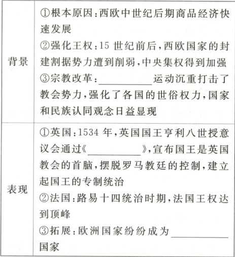 ②强化王权:15世纪前后,西欧国家的封建割据势力遭到削弱,中央集权得到加强