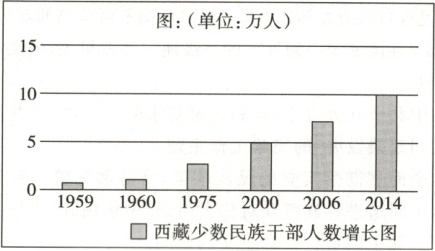 5.C [根据材料可知,自1959年起,少数民族干部人数不断增多,到2014年时,西藏少数民族干部数量就达到10万人之多,以西藏为例,其少数民族干部五十多年间增长了七倍多,再结合所学知识可知,大量民族干部人数的出现,提升了少数民族的自治能力,故选C项;“确保了边疆经济的高度繁荣”的结论说法过于绝对,排除A项;基层民主制度与民族区域自治制度不属于同一范畴,排除B项;实现中华民族伟大复兴是一个涵盖经济、政治、文化、社会、生态文明等多方面的宏大目标,仅根据材料信息无法得出这一结论,排除D项。]