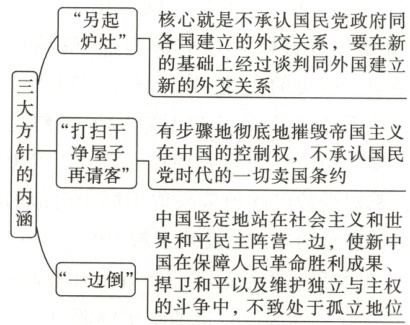 A[三大方针的内涵] --> B["‘另起炉灶’:核心就是不承认国民党政府同各国建立的外交关系,要在新的基础上经过谈判同外国建立新的外交关系"]