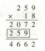 1.周末,小丽爸爸骑自行车去梁山龟山胜境公园游玩。他骑车的速度是259米/分,从家到公园骑行需要18分钟,从家到公园有多少米?小丽用竖式计算出了结果,右图竖式中红色圈住的“259”表示(