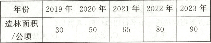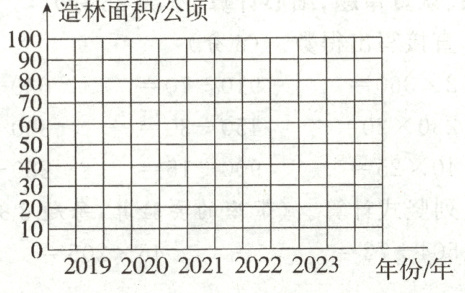 六、1.略(绘制条形统计图,横轴为年份2019 - 2023,纵轴为造林面积/公顷,每格代表10公顷,对应年份的直条高度分别为3格、5格、6.5格、8格、9格)