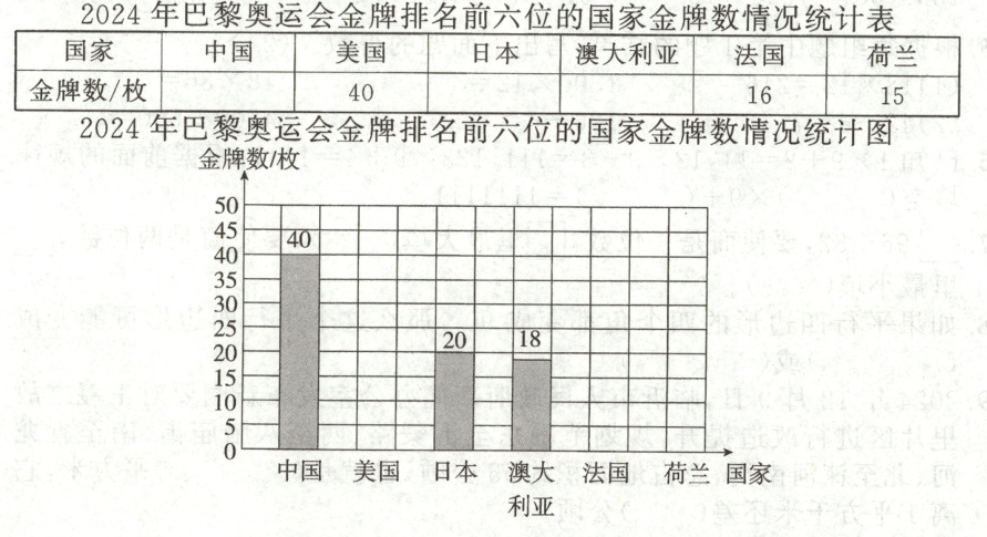 )枚金牌。(2) 根据统计表数据完成统计图,根据统计图填写统计表中空缺的数据。
