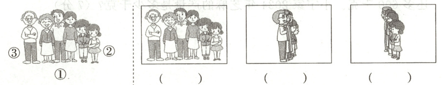1. 春节有贴春联,挂灯笼祈福的习俗。小林一家在院子里拍全家福,下面右边的三幅照片分别是在哪个位置拍的?把相应的序号填在括号里。
