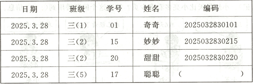 9. 人民小学举行了“赏花灯,猜灯谜”的元宵节主题活动。活动当天,为了便于统计,老师给每一位同学编了序号(如下表),将聪聪的编码填在表格内。