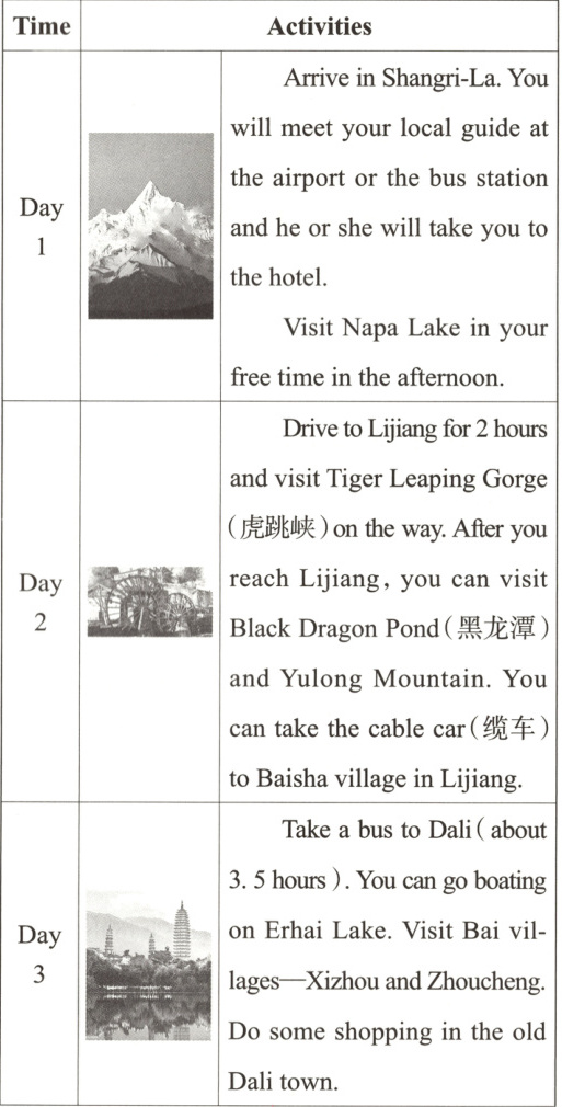 2.A 根据Day 1行程中的“Arrive in Shangri-la.You will meet your local guide at the airport or the bus station and he or she will take you to the hotel.”可知,当地的导游会带你到酒店。故选A。