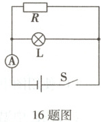 16.如下图所示,电源电压保持不变,电阻 R 与灯泡 L 并联,电阻 R 的阻值为 12 Ω,开关 S 闭合后,电流表的示数为 3 A,通过灯泡 L 的电流为 2 A。求: