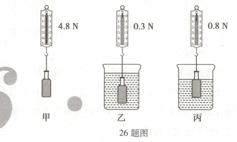 26. 在“探究浮力的大小跟哪些因素有关”的实验中,用密封透明的瓶子(质量和厚度不计,装有适量酸奶)替代原实验中的物体,如甲图。