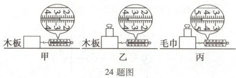 24. 在“研究影响滑动摩擦力大小的因素”实验中,将木块放在水平木板上,用弹簧测力计沿水平方向拉动木块做匀速直线运动。