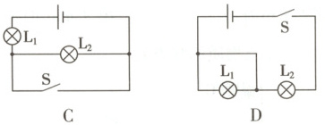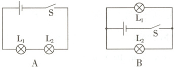 5.B [解析]A选项图中,开关闭合时,电流只有一条路径,依次经过这两个灯,L₁、L₂串联,故A不符合题意;B选项图中,开关闭合时,电流有两条路径,分别经过这两个灯泡,L₁、L₂并联,故B符合题意;C选项图中,开关断开时,两灯组成串联电路,开关闭合时,灯L₂被短路,故C不符合题意;D选项图中,开关闭合时,灯L₁被短路,故D不符合题意。