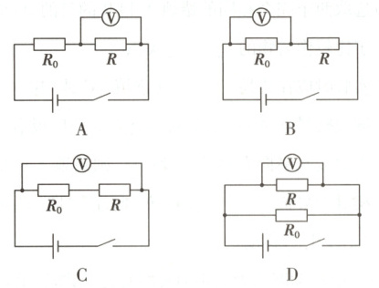 6. 某兴趣小组设计了酒精浓度检测仪的模拟电路,如图所示的电路图中,电源电压保持不变,$R_0$是定值电阻,$R$是气敏电阻,它的阻值随酒精气体浓度的增大而减小,能实现酒精气体浓度越大,电压表示数越大的电路图是 (