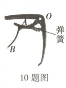 10. 如图所示是吉他的变音夹,两手柄绕$O$点转动,用力按压手柄时弹簧被压缩,说明力可以改变物体的