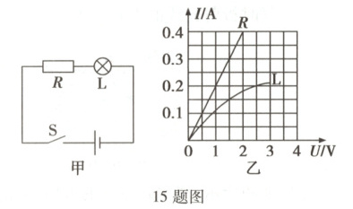 15.$0.2\ 2$ [解析]小灯泡的额定电压为$2.5 V$,由题图乙可知,小灯泡正常发光时的电流$I_{ 额} = 0.2 A$;定值电阻$R$的阻值$R = \frac{U_R}{I_R} = \frac{2 V}{0.4 A} = 5 \Omega$。由于定值电阻$R$与灯泡L串联,由于串联电路中电流处处相等,故通过$R$的电流$I = I_{ 额} = 0.2 A$,则通电$10 s$定值电阻$R$产生的热量$Q = I^2Rt = (0.2 A)^2 × 5 \Omega × 10 s = 2 J$。